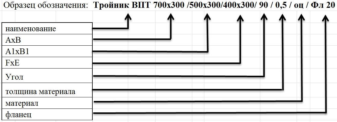 Если тройник равнопроходной (значение А и В одинаково для всех) в обозначении указывается только один размер — АхВ.